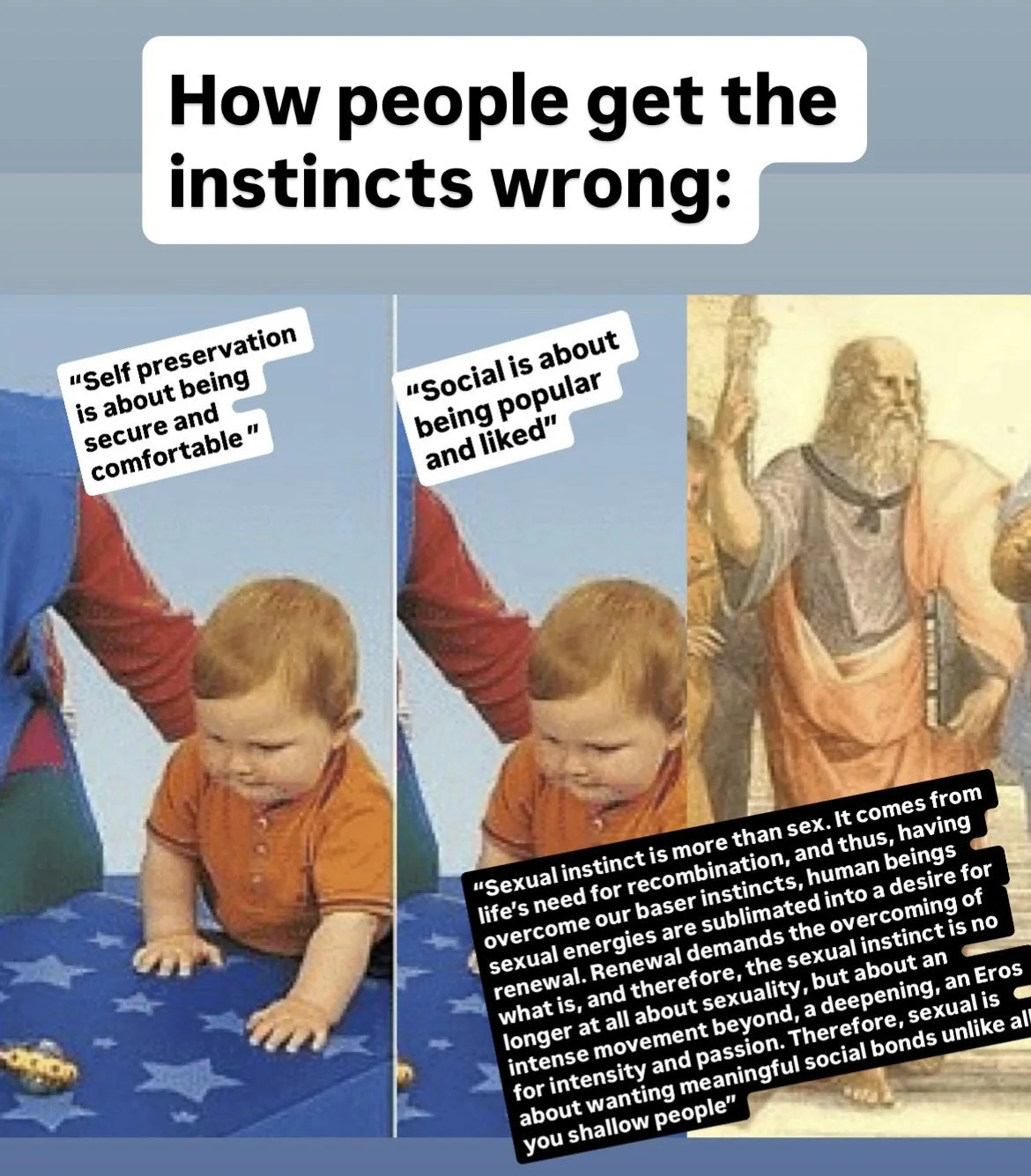 People tend to get very clunky and reductive about the self-preservation and social instincts, and then suddenly put on Greek philosopher robes about the sexual instinct — abstracting it into something hardly anyone can even pinpoint.